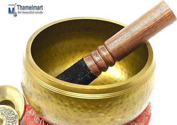 Fits in your Palm ~ Perfect Gift: this singing bowl easily fits in the palm of your hand, looks great on your desk or shelf and adds harmonious flavor to your decor. Its approximately 5.5” diameter with 3” height. It weighs approx. 1.5lb / or 24 oz or 700 grams. Also included suede leather wrapped Wooden mallet (Striker) and thick Hand sewn thick silk Cushion and Om Nama Shiva embossed Tingsha Cymbals. Make this Singing Bowl a Perfect Gift set to anyone who loves Yoga and meditation.