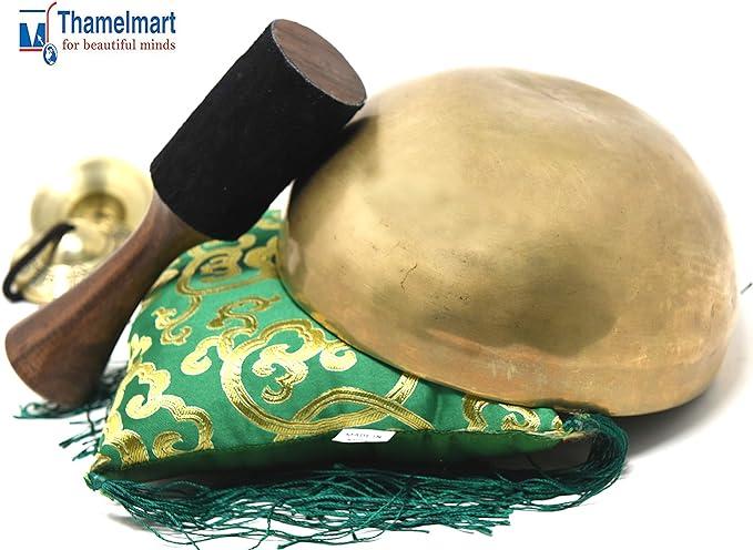 WHAT'S INCLUDED: This bowl looks cool on your desk or shelf. And makes your room peaceful. It's 7 inches across. And 3.5 inches in height. The bowl weighs around 2.10 pounds or 950 grams.You also get a 7-inch wooden hammer wrapped in suede leather and a green square silk cushion. And a 2.5-inch Tingsha- cymbalwith "Om Nama Shivay" carved on it.