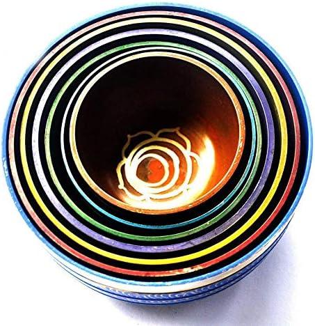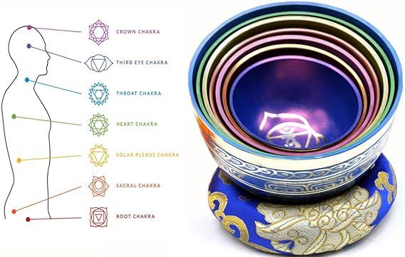 CHAKRA HEALING SINGING BOWL SET (Seven Chakra Colors with Chakra Symbols): This is a complete set of 7 pieces of Seven Chakra Singing Colors with Chakra Symbols Bowl set sizes from 2.5" to 5" in diameter. It is made of seven metals known as bronze alloy (also known as Bell metal) This set of bowls is best for Healing, Meditation, and balancing your energy.