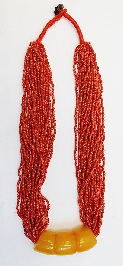 Length: approx. 20" long Weight: 3.8 oz. Craftsmanship: This is a carefully handcrafted product by skilled artisans in Nepal, ensuring unique beauty. Material: Red glass beads and huge amber are to decorate the necklace, Which has a strong twisted hook.